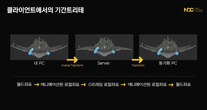 좌표 동기화도 과제였다. 서버는 애니메이션 시퀀스의 첫 프레임을 기준으로 한 컬리전 데이터만 가지고 있었기 때문이다. 이에 각기 다른 좌표계 변환이 필요했다. 내 PC에서의 월드 좌표를 애니메이션된 로컬 좌표로 변환하고 0프레임 로컬 좌표를 애니메이션 로컬 좌표로 바꿔 월드 좌표로 변환했다.