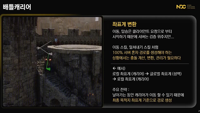 배틀캐리어로 인한 애로사항도 있었다. 좌표계의 변환 문제가 대표적으로, 이동 및 탑승은 클라이언트 요청으로 부터 시작하나, 이동 스킬 및 밀쳐내 기스킬과 같이 100% 서버만으로 경로를 생성해야 하는 상황에서는 충돌 계산 및 변환, 관리가 필요했다. 가령 배틀캐리어가 움직이는 동안에 캐릭터가 탑승을 시도할 수 있기 때문이다. 이에 중간 지점들의 좌표계를 모두 최종 목적지 좌표계 기준으로 경로를 생성하는 해결책을 적용하게 됐다.