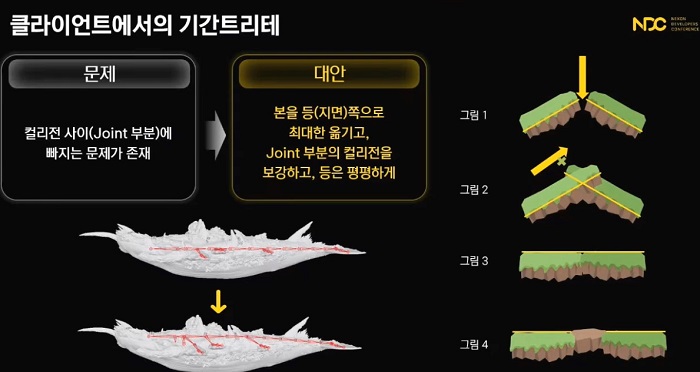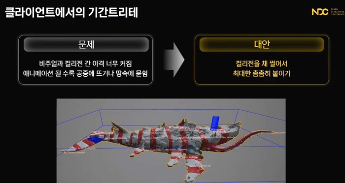 또 비주얼과 컬리전 간 이격이 너무 커지는 문제로 인해 애니메이션될 수록 공중에 뜨거나 땅 속에 묻히는 현상이 있었다. 이에 컬리전을 쪼개서 최대한 촘촘히 붙이는 방식을 시도했다. 컬리전의 조인트 부분에 빠지는 문제는 본을 기간트리테 지면 쪽으로 최대한 옮기고 조인트 부분의 컬리전을 보강 및 평평하게 했다.