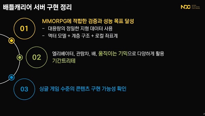결론적으로 MMORPG에 적합한 검증과 성능 목표를 달성하기 위해 대용량의 정밀한 지형 데이터 사용했으며 액터 모델과 계층 구조, 로컬 좌표계를 도입해 배틀캐리어 서버를 구현했다는 것이다. 아울러 엘리베이터와 관람차, 배 등 움직이는 기믹으로 다양하게 활용할 수 있게 됐으며, 싱글 게임 수준의 콘텐츠를 MMORPG에서 구현할 수 있는 가능성을 확인했다.