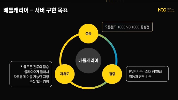 이와 같은 배틀캐리어를 서버에 구현하기 위한 목표를 실현하기 위해 성능, 자유도 , 검증으로 나뉘어 진행했다. PvP 기준으로 이동과 전투 검증을 먼저 진행하고, 자유로운 전투와 탑승, 그리고 플레이어가 들어서 자유롭게 이동 가능한 지형의 자유도를 살펴봤다. 마지막으로 오픈월드 1000vs1000 공성전에서 활용할 수 있는 성능을 확인했다.