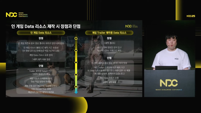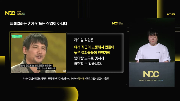 발표자는 퍼스트 디센던트 트레일러를 예시로 작업 방식을 설명했다. 라이팅 작업은 여러 직군이 만든 결과물을 빛이란 도구로 빚어내는 작업으로 빛과 그림자로 그림을 그려 게이머에게 정보와 기대감을 선사한다. 퍼스트 디센던트 개발 과정에선 실시간 라이팅과 리얼타임 렌더링, 인게임 데이터를 이용해 트레일러 라이팅을 제작했다.