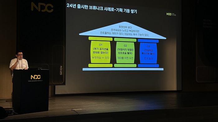 기획자가 경험한 좋은 경험이 유저에게 주고 싶은 좋은 경험이 된다는 점을 강조했다. 브류나크는 무기 포지션을 반대로 설정하면서 변화를 줬으며, 약점이자 장점인 단조로움을 탈피하면서 새로운 도전에 나선 것이다. 또 인상적인 특수 기능을 더하면서 한계를 돌파한 사례로 꼽았다.