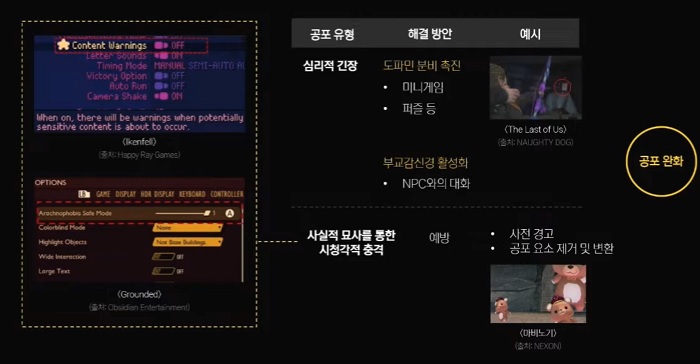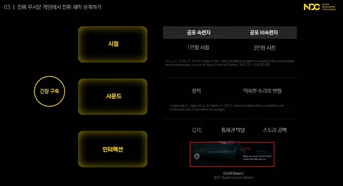 공포 게임 제작 시에는 유저의 숙련 정도에 대해서도 고려를 해야 하는데, 공포 숙련자의 경우 1인칭 시점에 정적인 사운드로 UX를 구현하고, 비숙련자는 3인칭 시점에 익숙한 소리의 변형으로 긴장을 구축한다. 아울러 인터랙션 요소로는 QTE와 통제권 박탈, 스토리 공백 등을 활용한다.