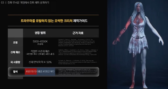 강동섭 UX분석가가 강조한 트라우마를 유발하지 않는 것도 매우 중요하다. 조명은 주광색의 5000~6500K 수준, 신췌 훼손은 신체 절단 및 내장 노출 등의 과현 혐오가 배제된 적절한 수준의 훼손, 피의 표현은 신체 면적의 약 4~50% 수준의 제작 가이드를 제시했다.