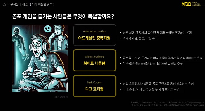공포 게임을 즐기는 유저의 유형도 소개했다. 공포 체험 자체를 즐기는 '아드레날린 중독자형', 공포 체험을 선호하지는 않지만 극복의지가 있고 성장하려는 '화이트 너클형', 그리고 현실 스트레스나 불안을 공포 콘텐츠로 해소하는 '다크 코퍼형' 등 세 가지 유형이 있다.