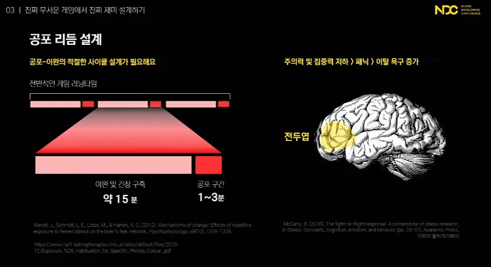 아울러 공포 리듬 설계에 대해서도 설명했다. 심리적 스트레스 완화 구간을 제공하면서 긴장감과 완화의 리듬을 조절하는 것이 중요하다. 긴장 상태가 지속될 경우 피로감을 느끼고 집중력을 잃게 되며, 공포의 강도가 높으면 심리적 부담이 가중된다. 특히 전두엽이 필요 이상으로 자극되면 최종적으로 이탈 욕구가 발생한다.