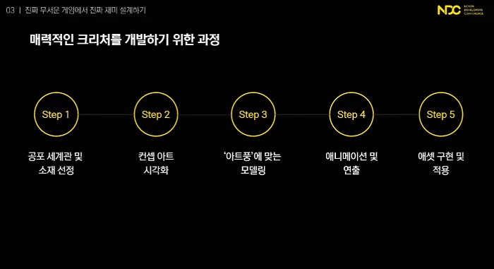 위압감과 공포감을 주는 크리처를 제작할 때 활용되는 네 가지 기법으로는 '인체 왜곡'과 '내러티브를 담은 형체', '섹슈얼리티 공포', '여운을 남기는 연출'이 있다. 매력적인 크리처를 개발할 때는 5개의 스텝을 거친다. 공포 세계관 및 소재를 선정하는 것을 시작으로, 컨셉 아트를 시각화하는 단계를 거친다. 다음으로 모델러가 아트풍에 맞는 모델링 작업을 하게 되며 애니메이션 및 연출을 통해 인게임 애셋으로 구현 및 적용하는 플로우를 거친다.