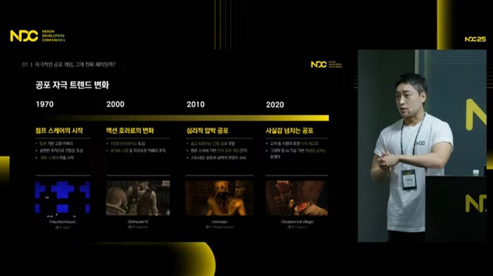 그는 공포 게임이'게임의 끝경험이 공포가 아닌, 몰입으로 기억되는 게임'이 되어야 한다는 점을 강조하면서, 공포 게임이 진짜 재미를 추구하는 방법에 대해 소개했다.