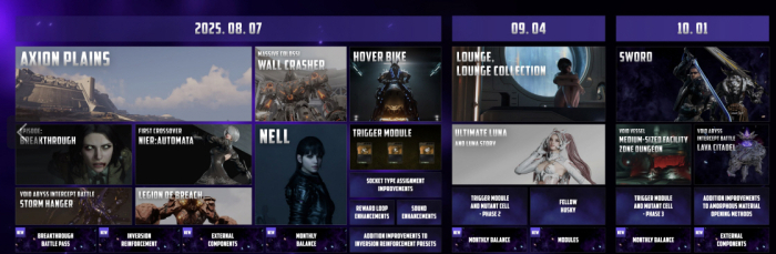 정해진 시간마다 액시온 중앙에 등장하는 필드 거신 '월크래셔'도 새로운 재미를 제공한다. 필드 거신 콘텐츠에는 최대 8인이 참여할 수 있고, 육중한 크기와 강력한 공격을 자랑하는 월크래셔를 이용자들과 함께 공략하는 재미를 느낄 수 있다. 레이드 콘텐츠 '심층부 요격전'에도 신규 보스 '스톰행어'가 추가된다. 스톰행어는 기존 '행드맨'의 변종이며 맞춤형 공략이 필요한 거신이다. 처치 시 '스톰행어 스킨'과 '콜로토이즈 스킨' 등으로 교환할 수 있는 '품질 보증 ETA 교환증'을 얻을 수 있다.