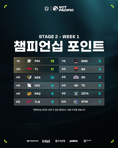 [자료제공 = 프레인] '발로란트'의 개발 및 유통사인 라이엇 게임즈(한국 대표 조혁진)는 15일(화)부터 20일(일)까지 서울 마포구 상암동에 위치한 상암 SOOP 콜로세움에서 열린 VCT 퍼시픽 스테이지 2의 정규 시즌 개막 주차 경기에서 알파 그룹에 속한 여섯 팀이 모두 1승1패로 마무리하면서 심상치 않은 조짐을 보이고 있다고 밝혔다.