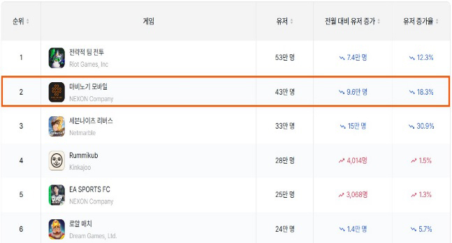 모바일 MMORPG 장르 내 10대 MAU 압도적 1위 기록