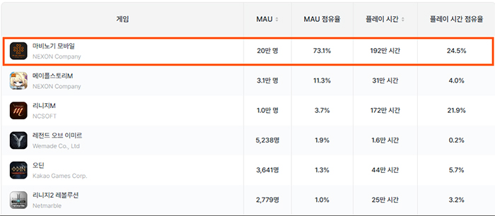 앱 통계 분석 플랫폼 모바일 인덱스에 따르면, 6월 기준 전체 모바일 게임 중 10대 MAU 상위 15위 내에 포함된 MMORPG는 '마비노기 모바일'이 유일하다. 동일 장르 내에서는 10대 MAU 20만 명, 73.1%라는 압도적인 점유율로 1위를 차지했으며, 한 달 누적 플레이 시간은 약 192만 시간으로, 무려 219년에 달하는 수치다.