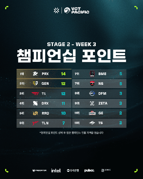 [자료제공 = 프레인] 5대5 대전형 캐릭터 기반 전술 슈팅 게임 '발로란트'의 개발 및 유통사인 라이엇 게임즈(한국 대표 조혁진)는 8월 1일(금)부터 3일(일)까지 서울특별시 마포구 상암동에 위치한 SOOP 콜로세움에서 열린 VCT 퍼시픽 스테이지 2 3주 차에서 한국 팀들이 대거 플레이오프 티켓을 손에 넣었다고 밝혔다.