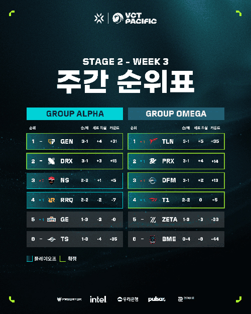 알파조의 혼전 양상을 정리한 팀은 젠지와 DRX였다. 2주 차에서 나란히 승리하며 치고 나온 젠지와 DRX는 3주 차에서도 각각 팀 시크릿과 렉스 리검 퀀을 2대0으로 셧아웃시키면서 플레이오프 티켓을 거머쥐었다.