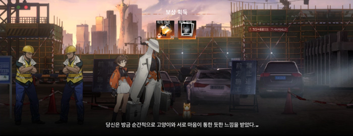 습득 가능한 숨겨진 보상은 총 2개입니다. 공사장 한복판에 있는 고양이에게 상호작용을 걸어 계속 고양이를 쓰다듬는다 선택지를 반복할 경우 '고양이의 생각을 추측한다' 선택지가 활성화되며 이를 고르면 월상석 가루 30개와 함께 '굿드림 매트릭스'가 사건 조사 목록에 팝업되는 것을 확인할 수 있습니다.