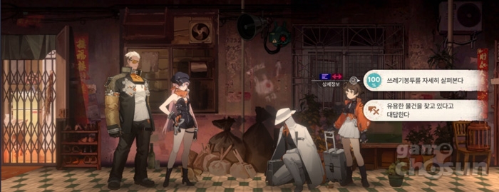 아파트에 진입해서는 왼쪽으로 이동하고 손님이 왔음을 외치는 메가폰까지 도달하면 아래에 있는 쓰레기 더미에 탐색 상호 작용이 활성화되는데요. 이 때 '쓰레기봉투를 자세히 살펴본다'는 특기 요구 선택지를 고르면 기초 작전 교본을 보상으로 획득 할 수 있습니다.