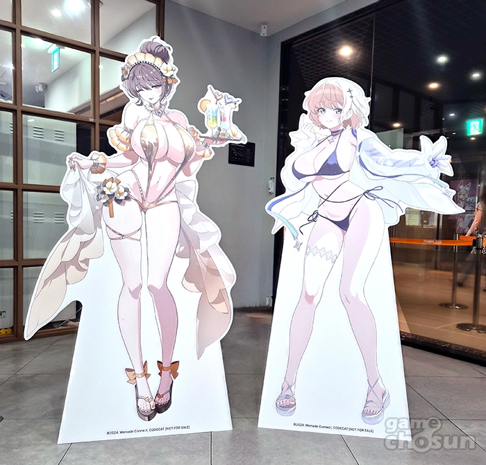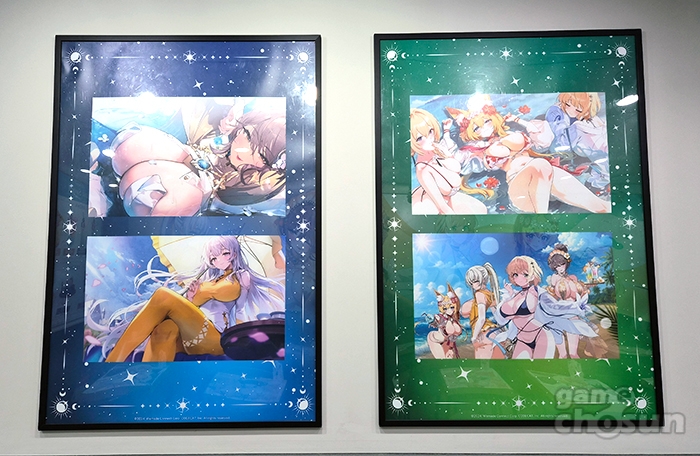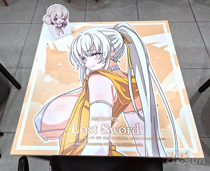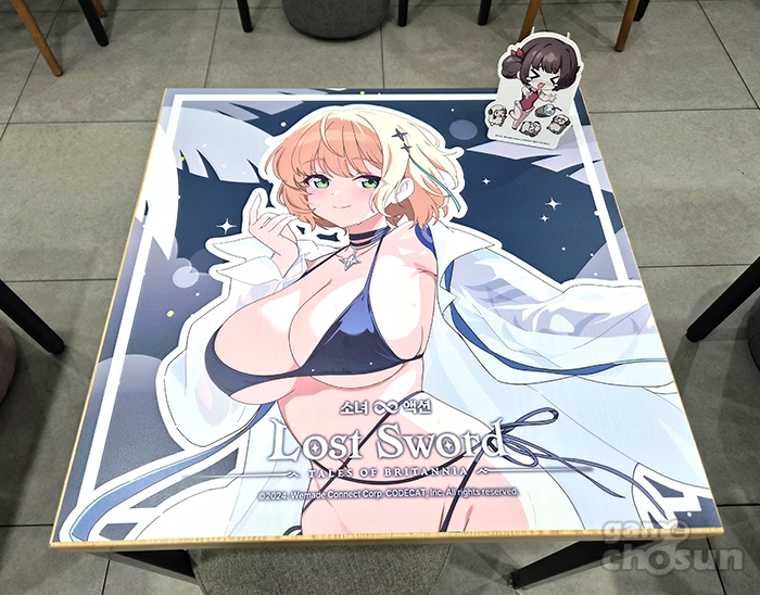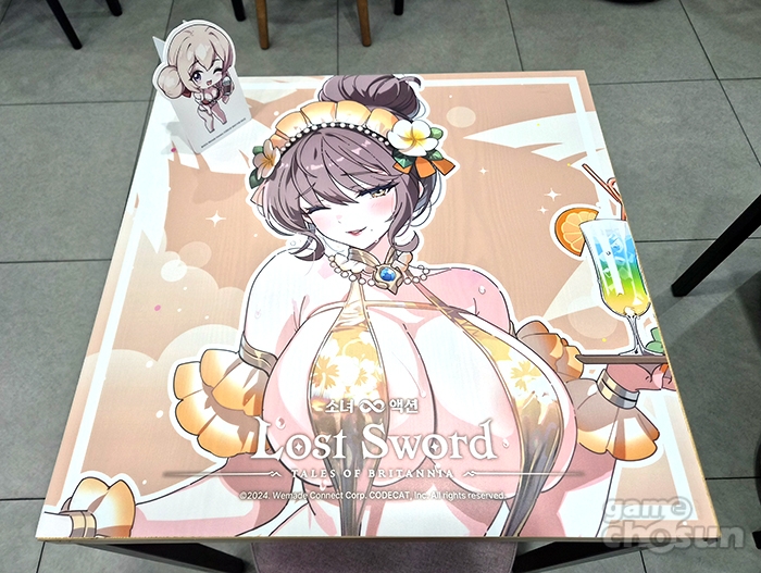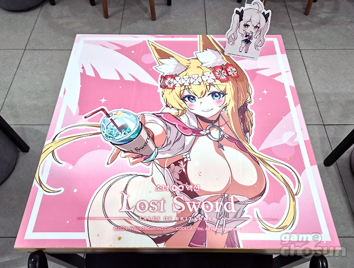 이번 콜라보 카페는 여름 바캉스를 테마로 진행되며 '진 베디비어', '란슬롯', '디안 케트'와 신규 캐릭터 '해변의 메리'가 주역으로 활약합니다. 로스트 소드 특유의 밝은 이미지의 캐릭터들, 그리고 각자 비키니 페스티벌 캐릭터들인 만큼 매장 곳곳에서 큼직한 캐릭터 일러스트를 확인할 수 있었습니다. 또, 실제로 현장에서 이들이 그려져 있는 테이블이 반겨줍니다.