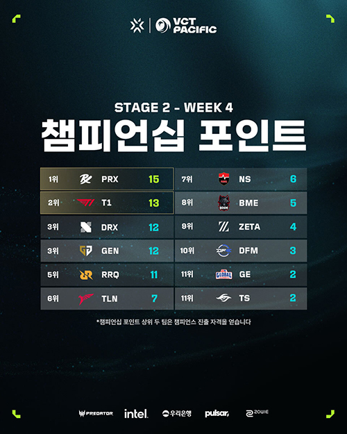 VCT 퍼시픽 스테이지 2 플레이오프는 오는 8월 13일(수) 개막한다. 각 조의 1위 팀은 플레이오프 2라운드에서 시작하며 4위 팀은 하위조 1라운드부터 경기를 치른다. 2위 팀은 반대 조의 3위 팀과 상위조 1라운드에서 맞붙는다.
