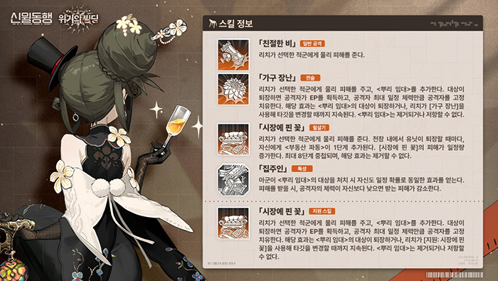 지원 스킬 '시장에 핀 꽃'은 리치가 선택한 적군에게 물리 피해를 주고, '뿌리 임대'를 추가합니다. 대상이 퇴장하면 공격자가 EP를 획득하고, 공격자 최대 일정 체력만큼 공격자를 고정 치유합니다. 해당 효과는 '뿌리 임대'의 대상이 퇴장하거나, 리치가 [지원: 시장에 핀 꽃]을 사용해 타깃을 변경할 때까지 지속됩니다.