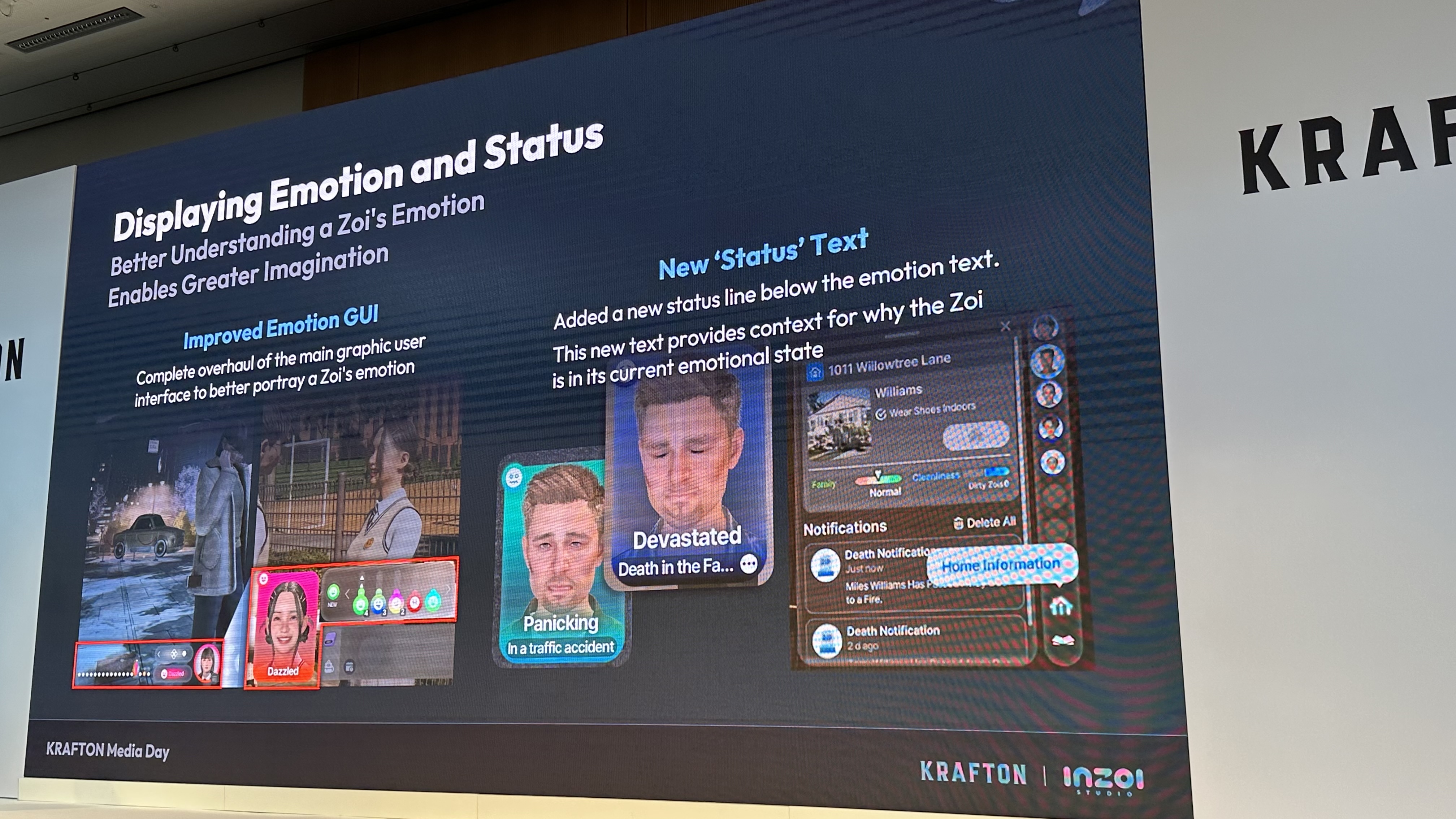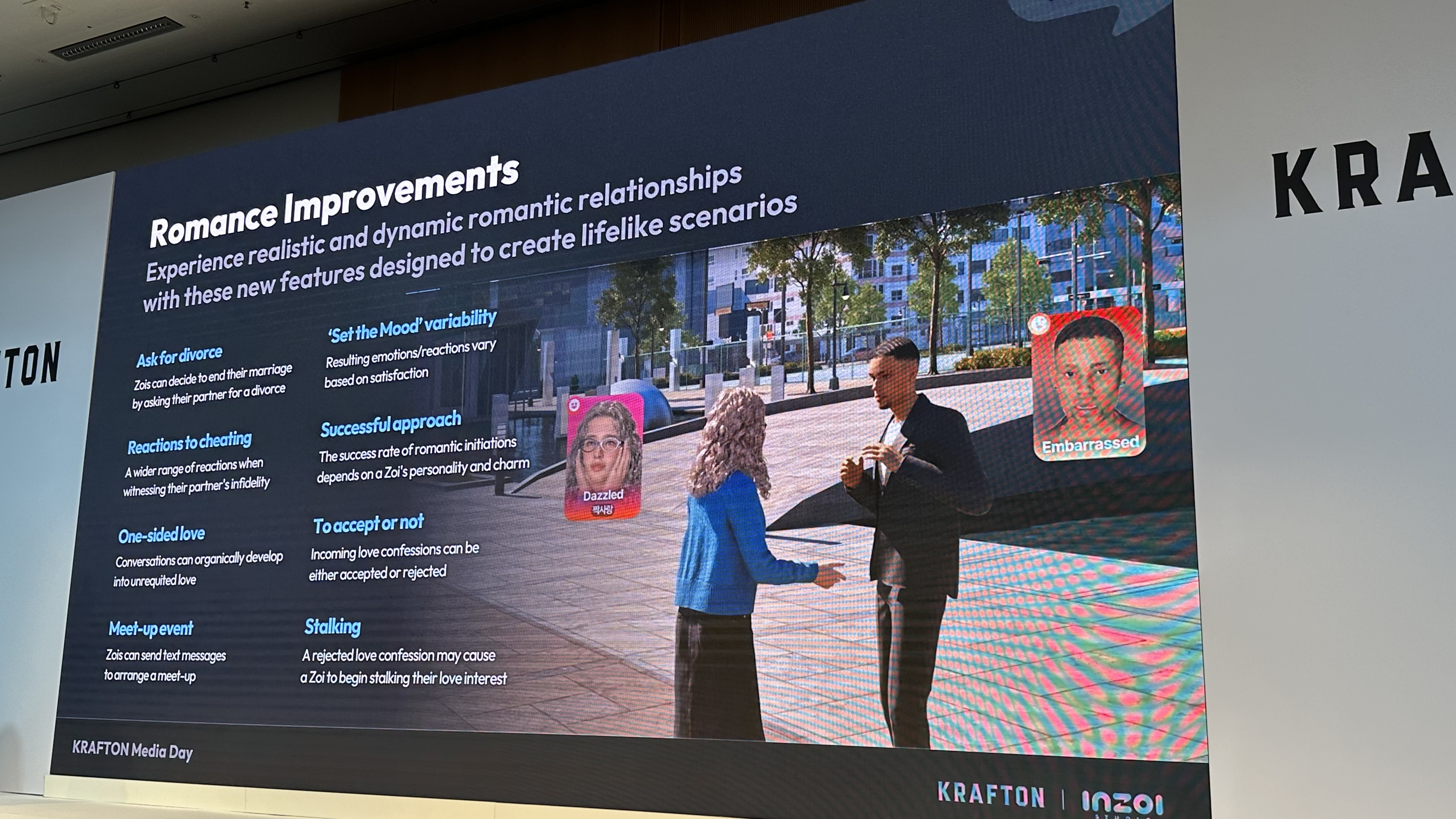 이날 미디어데이에서 가장 눈길을 끌었던 것은 인조이와 LLM의 만남이다. AI를 통해 조이가 대화 방향을 스스로 도출해낼 뿐만 아니라, 감정에 따른 대화와 표현을 하면서 NPC의 영역을 뛰어넘는 조이 시연을 공개했다. 스스로 대화 방향을 풀어나가는 AI 기능은 현재 초기 개발 단계에 있으며, 해당 기능을 완성시켜 진정한 인생 시뮬레이션 게임으로 거듭나겠다고 언급했다.