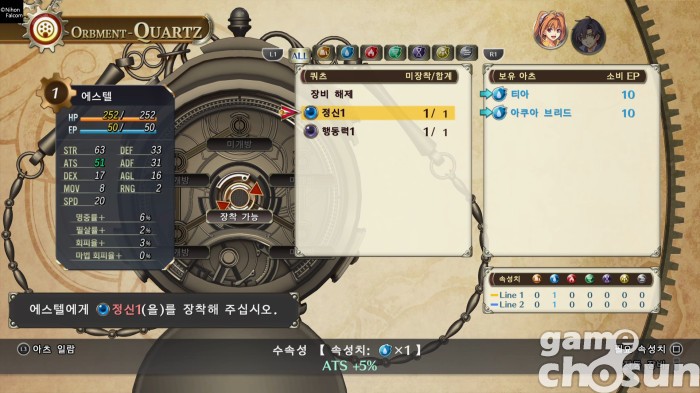 캐릭터 성상 요소는 레벨 상승과 장비 교체 등 다양한 방법이 있지만, 궤적 시리즈인 만큼 '오브먼트'를 빼놓을 수 없다. 오브먼트는 다양한 속성을 지닌 '쿼츠'를 장착해 소유 캐릭터의 능력치를 높이고, 누적 속성치에 따라 아츠를 사용하게 만들어주는 도구다. 아츠가 늘어날수록 그 캐릭터가 사용할 수 있는 전술도 늘어나는 만큼 쿼츠 제작과 조합에 많은 시간을 투자하게 된다.