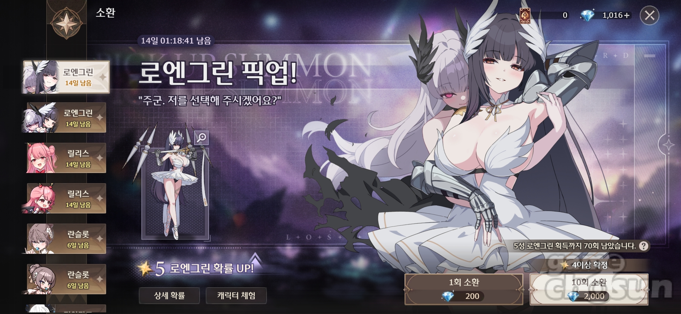 로엔그린은 패시브 스킬을 통해 공격력과 공격 속도가 증가할 뿐만 아니라 공격 시 추가 타격이 발생하며, '블랙 스완'과도 공유를 하는 특징이 있습니다. 액티브 스킬로 치명타 확률까지 증가하는 것은 덤입니다.