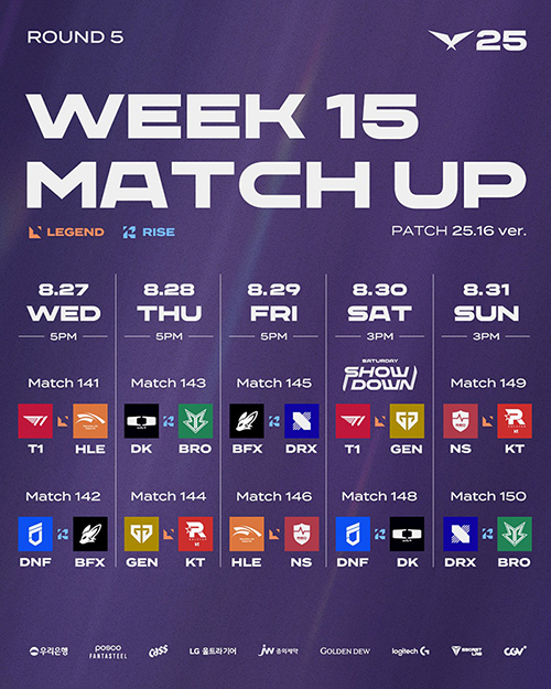 레전드 그룹으로 편성된 이후 세 번째 펼쳐지는 두 팀의 맞대결은 30일(토) ‘새터데이 쇼다운’에서 성사된다. 지난 7월 25일 T1은 홈그라운드에서 젠지를 2대1로 꺾으며 젠지의 시즌 전승을 끊은 유일한 팀이 됐고 8월 7일 4라운드 맞대결에서는 젠지가 2대1로 승리하며 설욕에 성공했다.