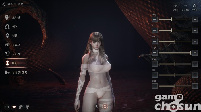 캐릭터 생성 단계에선 헤어와 얼굴, 눈동자, 꾸미기, 바디, 음성 6가지 요소를 조합해 외형을 정하게 된다. 이중에서 바디의 경우 체형과 키, 머리, 가슴, 허리, 골반, 하체 슬라이드를 조정해 세부 조절할 수 있다. 게이머들이 가장 기대하는 기본적인 요소를 제공하는 셈이다.