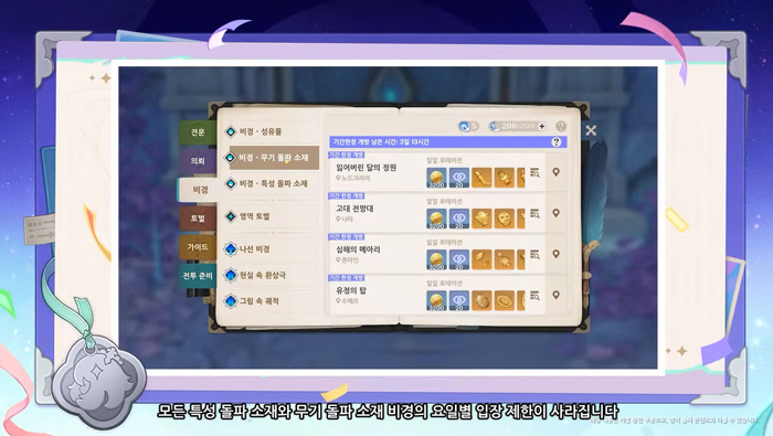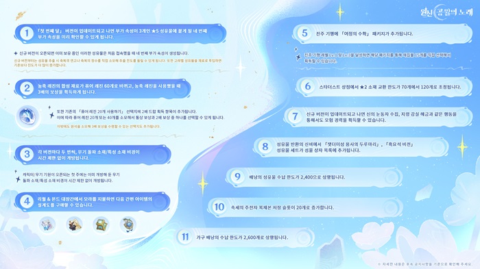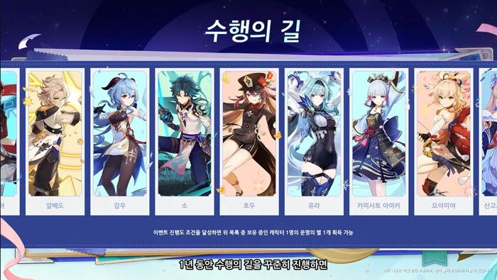 그 외에도 신규 콘텐츠 '수행의 길'을 통해 매주 주어지는 수행 목표를 꾸준히 달성한다면 한정 캐릭터를 포함한 모든 보유 캐릭터의 '운명의 길'을 선택 획득할 기회가 주어지며, 1년동안 수행의 길을 꾸준히 진행한다면 5성 캐릭터 4명분의 운명의 별을 획득할 수 있기 때문에 보유하고 있는 캐릭터들의 돌파 효율을 계산하고 득실을 잘 따져가며 게임을 플레이한다면 큰 도움이 될 것으로 보인다.