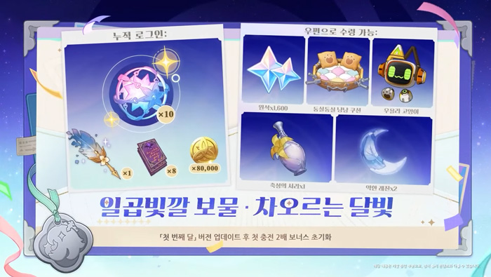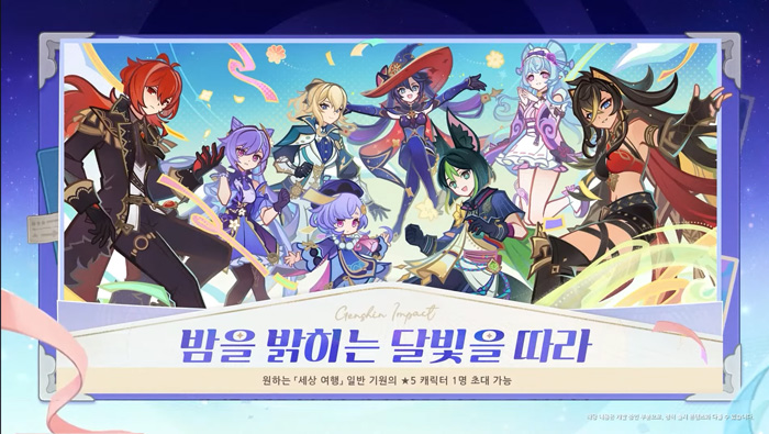 5주년 업데이트에서는 20회 분량의 기원을 진행할 수 있는 재화를 비롯하여 첫 충전 2배 보너스 초기화, 상시 5성 캐릭터 초대 이벤트가 진행된다. 특히 이번 5성 캐릭터 초대 이벤트에서는 즉시 60레벨까지 육성할 수 있는 재료가 주어지고 이나즈마의 '유메미즈키 미즈키'가 라인업에 추가되기 때문에 본인이 보유한 캐릭터 풀에서 필요한 캐릭터를 더욱 신중하게 고를 필요가 있다.