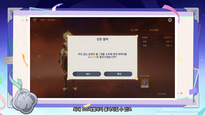 특히 '레벨 상한 돌파'는 기초 HP/공격력/방어력만 올라가지만 운명의 자리를 모두 활성화한 6돌파 캐릭터가 아닌 다른 캐릭터에도 사용할 수 있고 상한선이 오르는 만큼 현재 레벨도 올라가기 때문에 경험치 책과 모라를 들여 별도의 레벨업을 진행할 필요가 없으며 '첫번째 달' 버전 이전까지 6돌파를 초과한 계정 내 기원 기록을 전부 계산하여 '주인 없는 운명의 별'을 지급하는 파격적인 소급 적용을 도입하기 때문에 오랜 시간동안 게임을 플레이하며 많은 재화를 투자했던 여행자들에게는 충분한 보상이 될 전망이다.