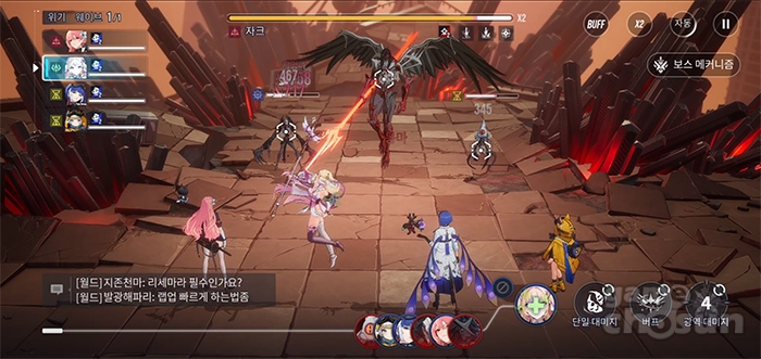 4인 파티 기준, 일부 콘텐츠는 5인까지 동시 출전해서 싸우게끔 되어 있습니다. 캐릭터마다 매 턴 3개의 행동을 선택할 수 있고, 재사용 시간이 존재하므로 무작정 강한 스킬부터 때려 박는 것이 아니라 정해진 행동 순서를 보고 신중하게 선택해야 합니다.