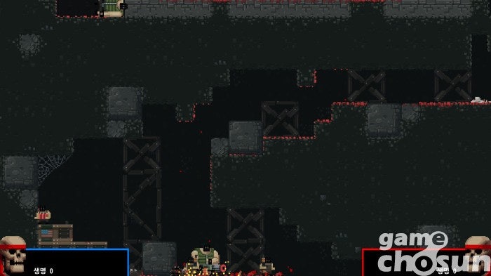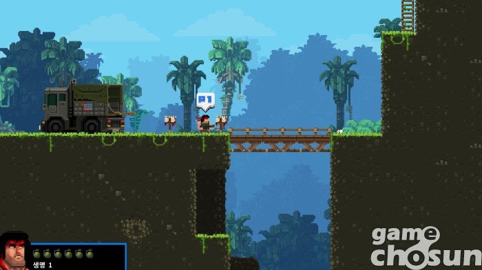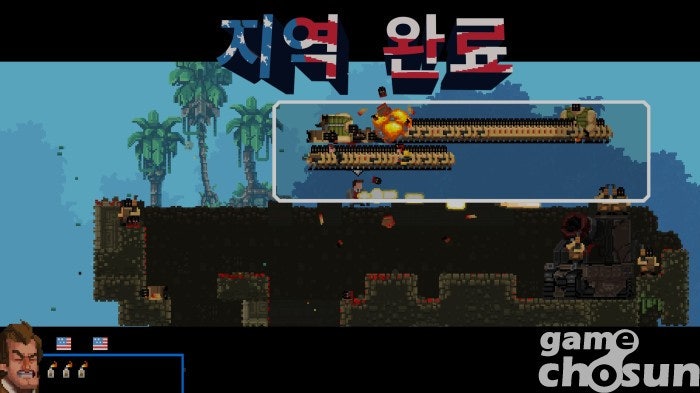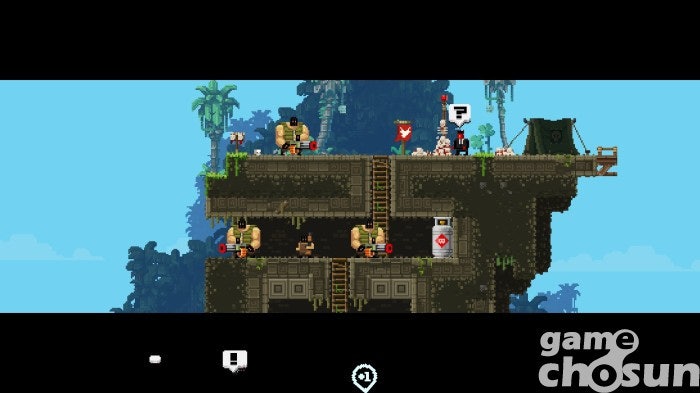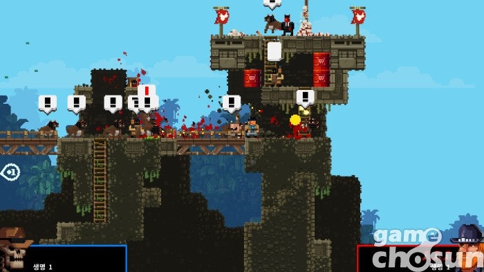 하지만 브로들은 영화 주인공들과 달리 꽤 약합니다. 적의 총알 한 발, 사냥개의 이빨 한 번에 픽픽 쓰러지죠. 그렇게 조종하는 브로가 쓰러지면 미션 중 구했던 다른 브로가 이어서 미션을 진행하고, 남은 브로가 없다면 미션에 실패해 처음부터 다시 시작하게 됩니다. 횡스크롤 슈팅에 익숙하지 않은 분들은 내가 특수 부대원과 게임을 하는지 개복치들과 게임을 하는지 헷갈릴 정도죠.