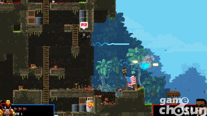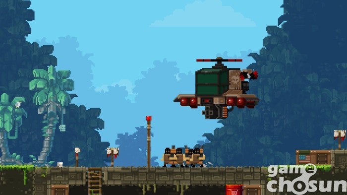 위험요소는 적뿐만이 아닙니다. 이 게임은 눈에 보이는 대부분의 지형을 부술 수 있고, 그래서 죽는 방법도 다양합니다. 적의 공격에 죽는 것은 당연지사. 잘못 만진 폭탄에 터져 죽고, 떨어지는 바위나 트럭에 죽는 것도 비일비재, 시야가 없는 곳에 설치된 함정이나 가시에 죽는 일도 많습니다. 호쾌하게 부수다 보면 호쾌하게 죽기 때문에 내 브로가 어떤 공격을 하고, 어떤 식으로 적들과 지형을 파괴할지 파악할 필요가 있죠.