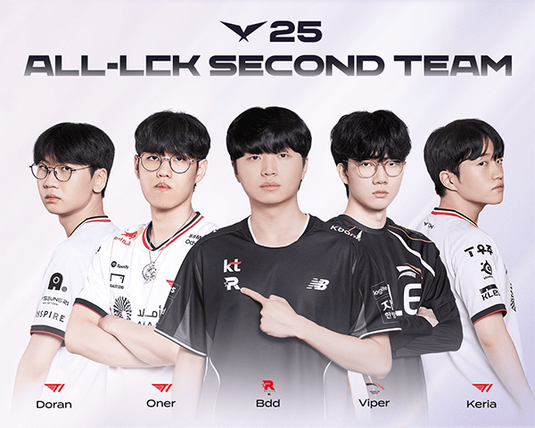 이 과정을 모두 함께 만들어낸 젠지의 탑 라이너 '기인' 김기인, 정글러 '캐니언' 김건부, 미드 라이너 '쵸비' 정지훈, 바텀 라이너 '룰러' 박재혁, 서포터 '듀로' 주민규는 2025 ALL LCK 퍼스트 팀으로 선정됐다. 올 시즌을 앞두고 합류한 박재혁은 2022년 서머 이후 3년 만에 퍼스트 팀에 이름을 올렸고 주민규는 데뷔 이래 처음으로 퍼스트 팀에 합류하는 영광을 안았다. ALL LCK 퍼스트 팀으로 선정된 젠지의 주전 5명에게는 각각 400만 원의 상금이 주어진다.