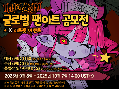 대상(1명)은 $ 150 상당 상품권 디지털 코드를, 본상(4명)은 $ 75 상당 상품권 디지털 코드를 지급할 예정이며, 특별상(참가자 비례 선정)으로 $ 25 상당 상품권 디지털 코드를 증정할 예정이다. (아마존, 구글 플레이, 스팀 월렛 택1)