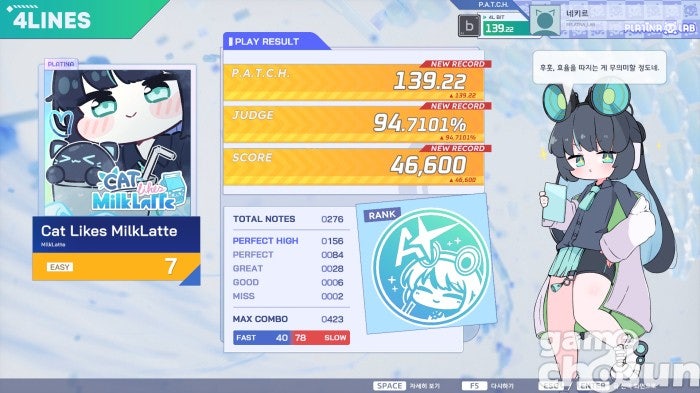 게임은 일반적인 세로형 건반 리듬 게임 방식이며, 4키와 6키를 제공합니다. 그리고 가장 마음에 들었던 점은 박자를 놓쳐도 게임이 끝나지 않고, 정확히 맞췄을 때 판정을 퍼펙트와 퍼펙트 하이로 나눈 부분이었습니다. 순수하게 노래에 따라 박자를 맞추는 손맛을 느낄 수 있는 방식이라고 할까요? 기자 같이 리듬 게임을 잘 못하는 게이머도 게임을 충분히 즐길 수 있었습니다.