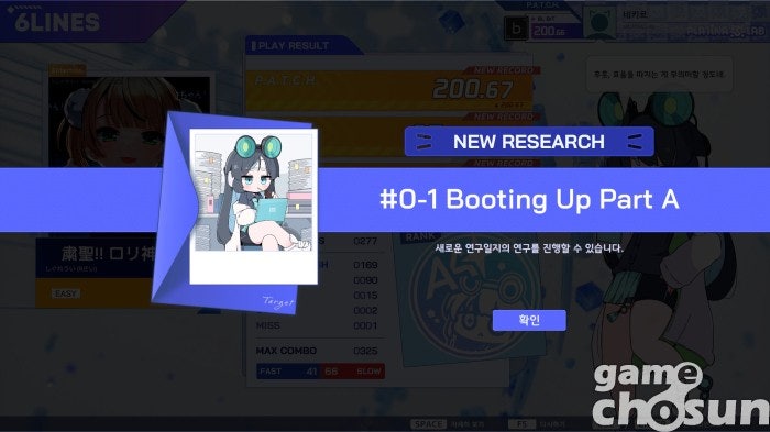 곡 해금은 연구로 할 수 있습니다. 일종의 퀘스트라고 할까요? 연구 목표는 특정 곡을 특정 성적 이상으로 받거나 아무 곡을 일정 수 이상 플레이하면 달성됩니다. 즉, 실력으로 곡을 따지 못한다면 그냥 많이 플레이하기만 해도 되는 것이죠. 해금 방식을 택한 리듬 게임 중에선 가장 쉬운 방식이 아닐까 생각합니다.