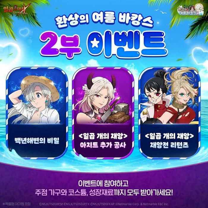 환상의 여름 바캉스 2부 이벤트 개최 소식도 전했다. 이벤트는 크게 '백년해변의 비밀'과 '<일곱 개의 재앙>의 아지트 추가 공사 이벤트', <일곱 개의 재앙> 스페셜 재앙전 리턴즈', 그리고 '스페셜 미션 2부' 등이 개최되는데, 백년해변의 비밀은 스토리 이벤트로, 스테이지 클리어 시 주점 꾸미기용 아이템인 시사이드 가구와 다이아 등의 보상을 제공한다.