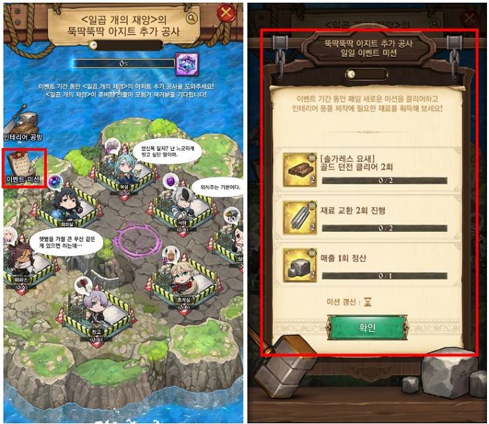 아지트 추가 공사 이벤트는 특별 일일 이벤트 미션을 달성해 획득하는 재료로 인테리어 용품을 제작하고, 아지트 이벤트 맵에서 각 공간에 인테리어 용품을 공급하면 다양한 보상을 얻는 방식이다. 이벤트 최종 완료 보상으로는 진각성 코인이 주어지며, 이외에도 코스튬과 신규 아티팩트 카드, 망치 등을 얻을 수 있다.