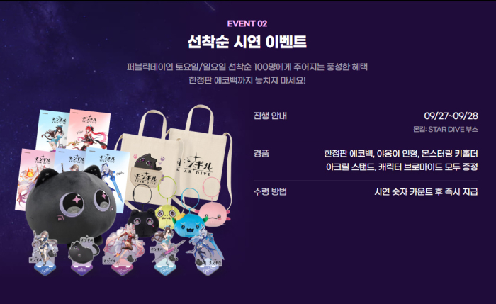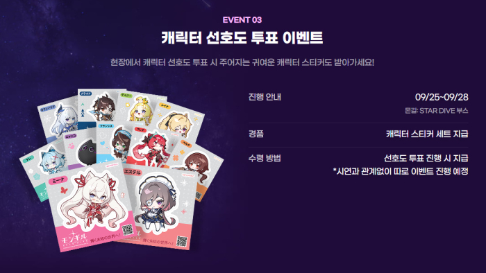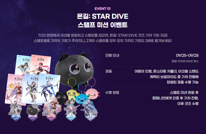 몬길: 스타 다이브는 '몬길: STAR DIVE 스탬프 미션 이벤트'와 '선착순 시연 이벤트', '캐릭터 선호도 투표 이벤트'가 진행된다. 행사에 참여한 방문객은 야옹이 인형, 몬스터링 키홀더, 아크릴 스탠드, 캐릭터 스티커 등을 받을 수 있다.