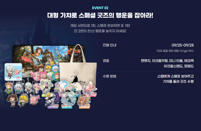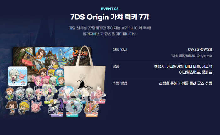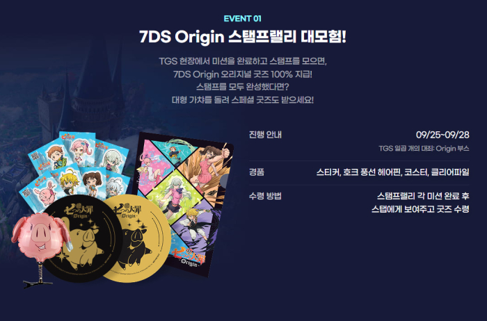 먼저 일곱 개의 대죄: 오리진은 '7DS Origin 스탬프랠리 대모험!'과 '대형 가챠로 스페셜 굿즈의 행운을 잡아라!', '7DS Origin 가챠 럭키 77!', 'DS Origin 대추첨회'를 진행한다. 해당 행사에 참여한 방문객은 호크 풍선 헤어핀, 아크릴스탠드, 장패드, 캔뱃지 등을 받을 수 있다.