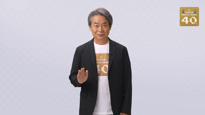 대표이사 '미야모토 시게루'는 '슈퍼 마리오 브라더스' 1편의 도트 그래픽으로 디자인된 40주년 티셔츠를 입은 채로 등장하여 마리오 시리즈는 디지털 기술 및 게임기와 함께 진화하여 지금까지 꾸준히 사랑받았을 수 있었다는 감사인사를 전했다.