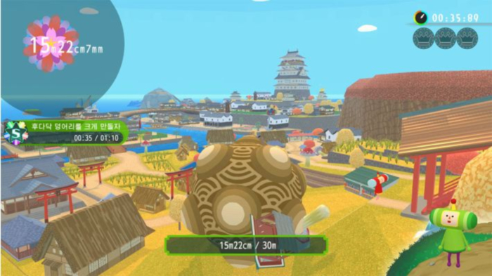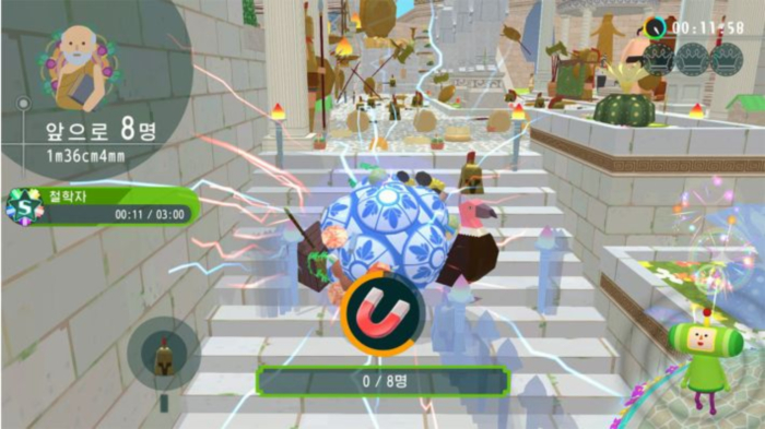 이시다: 괴혼 특유 감성을 먼저 드리면 떨어져 있는 물건이 많고 엉망인 세계다. 덩어리의 크기만 비교하는 것이 아니라 스테이지 에어리어에서 포인트를 변환할 수 있는데 작은 상태로도 변환할 수 있고, 클 때 변환할 수도 있다. 한 번에 역전을 할 수도 있어 다른 사람의 전략을 보면서 즐길 수 있다.