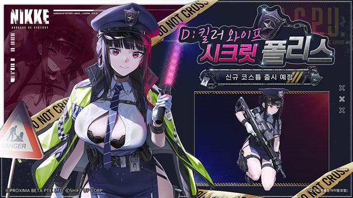 니케 측에서는 'A.C.P.U'의 '폴리', '미란다', '키리'가 주역으로 활약하는 것 같고, 역시나 이런 뒷세계 전문 해결사 'D'가 참여하는 것으로 보입니다. 'D'는 'D : 킬러 와이프'의 코스튬 픽 코스튬 'D : 킬러와이프 - 시크릿 폴리스'가 공개되기도 했습니다. 와이프 연기 중이라 순한 얼굴이 특징입니다.