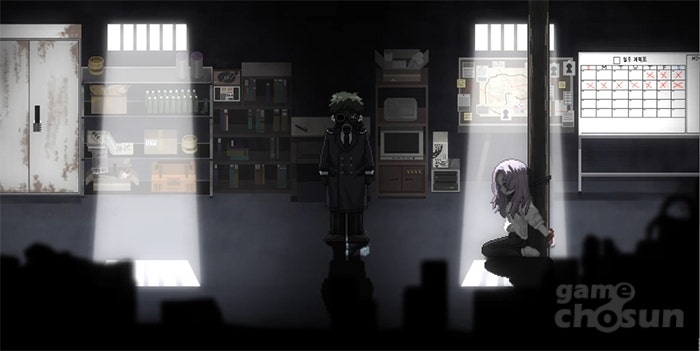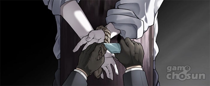 다만, 지하실에 남자 혼자만 있는건 아닙니다. 왠지 모르게 다소 적대적인 여성 '모란'이 함께 갇혀있죠. 기둥에 묶인 그녀는 묶여있지만, 자유롭게 돌아다니는 남자보다 더 자신감 넘치는 태도로 남자를 압도합니다.