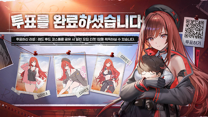 당시 3가지 디자인 중에서 슬리브리스에 돌핀 팬츠를 착용한 잠옷 차림의 라피 코스튬이 1위를 차지한 바 있습니다. 가장 오래 지휘관을 곁을 지킨 메인 히로인격 캐릭터인 '라피'가 이번에야말로 소원 성취를 할 수 있을지도 기대됩니다.