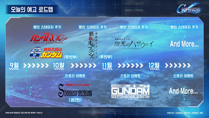 하반기 로드맵의 핵심은 메인 스테이지의 2분할 업데이트 정책으로 인해 깔끔하게 완결되지 않았던 '기동무투전 G건담', '기동전사 건담 철혈의 오펀스' 등 일부 시리즈의 후반부 콘텐츠와 우주세기 후반부를 다루는 '기동전사 건담 UC', '기동전사 건담 섬광의 하사웨이'를 선보이는 것이었다.