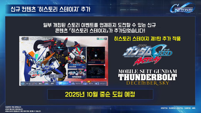 10월 중순에는 시드 아스트레이, 썬더볼트 등 지나가버린 이벤트 콘텐츠를 다시 플레이할 수 있는 히스토리 스테이지가 추가되어 반주년 이후 유입되는 신규, 복귀 이용자들도 쉽게 좋아하는 유닛과 도감을 채울 수 있도록 바뀌며 메인 스테이지 클리어 시 개발 재료 획득 확률과 획득량, 보유가능 유닛수 증가를 통해 게임이 보다 이용자 친화적인 방향으로 개선된다.